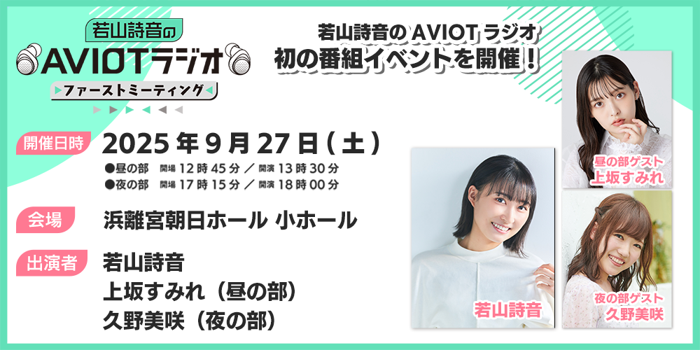 8/24まで一般抽選受付中!9/27『若山詩音のAVIOTラジオ 』上坂すみれ&久野美咲ゲスト