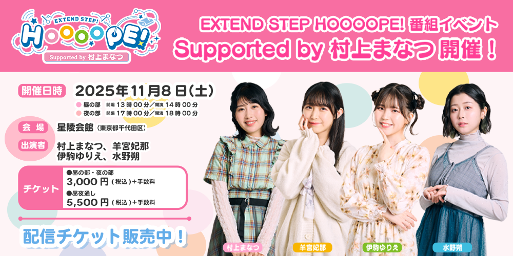 有料配信が決定!現在販売中!11/8(土)「EXTEND STEP HOOOOPE! 番組イベント Supported by 村上まなつ」出演:村上まなつ、羊宮妃那、伊駒ゆりえ、水野朔